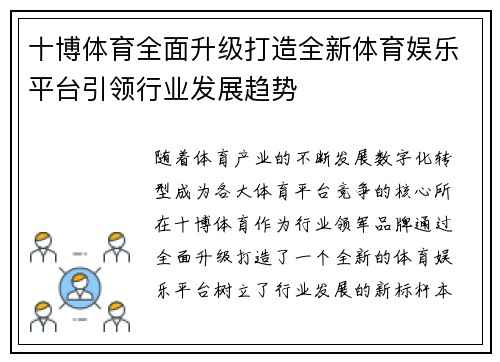 随着体育产业的不断发展,数字化转型成为各大体育平台竞争的核心所在。十博体育作为行业领军品牌,通过全面升级,打造了一个全新的体育娱乐平台,树立了行业发展的新标杆。本文将从四个方面详细阐述十博体育如何通过技术创新、用户体验优化、内容多元化和营销策略升级,全面引领行业发展趋势,推动体育娱乐领域向前发展。文章将逐步分析这些升级所带来的影响,并探讨其未来发展的潜力与挑战。