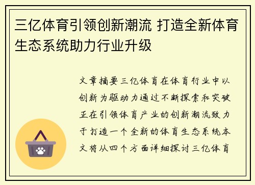 文章摘要:三亿体育在体育行业中以创新为驱动力,通过不断探索和突破,正在引领体育产业的创新潮流,致力于打造一个全新的体育生态系统。本文将从四个方面详细探讨三亿体育如何通过技术创新、资源整合、产业升级和用户体验等举措,推动行业的发展,并为未来的体育产业带来变革。首先,三亿体育通过技术手段为传统体育产业赋能,增强其可持续发展能力;其次,资源整合与跨界合作的模式使其在产业链条上形成了全新的生态;第三,通过产业的升级与市场的深度挖掘,三亿体育为行业带来了新的生机和活力;最后,三亿体育通过创新的用户体验设计,提升了体育产品的吸引力和用户粘性。全篇将系统地阐述三亿体育如何通过这四个方面助力体育行业的升级与发展。